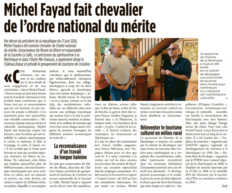 Le journal "Antilla"de Martinique décide de re-publier un article de Michel Fayad datant de janvier 2002, intitulé "Le rôle de la distillerie agricole dans le cadre d'un tourisme culturel à la Martinique" connue aujourd'hui sous le titre :"Discours fondateur du Spiritourisme" à la Martinique"