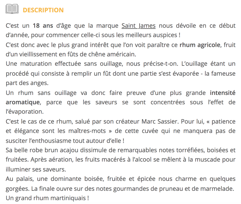 Initialement, le rhum Saint-James était destiné à l’exportation. Il n'y avait pas de consommation locale de rhum à la Martinique, tout était exporté en vrac vers les ports de Nantes et Bordeaux. Entré sur le marché européen dans les années 1870, Saint-James devient la première marque de rhum agricole de Martinique. Il est rapidement reconnu comme une marque emblématique. Il est d’ailleurs mentionné dans le Larousse des marques du siècle. En 1902, après l’éruption de la montagne Pelée, la distillerie est en partie détruite et déploie ses activités sur plusieurs sites, dont celui de Sainte-Marie en 1974. En 1996, le rhum Saint-James bénéficie de l’appellation d’origine contrôlée, garantissant un produit de qualité respectueux des traditions.