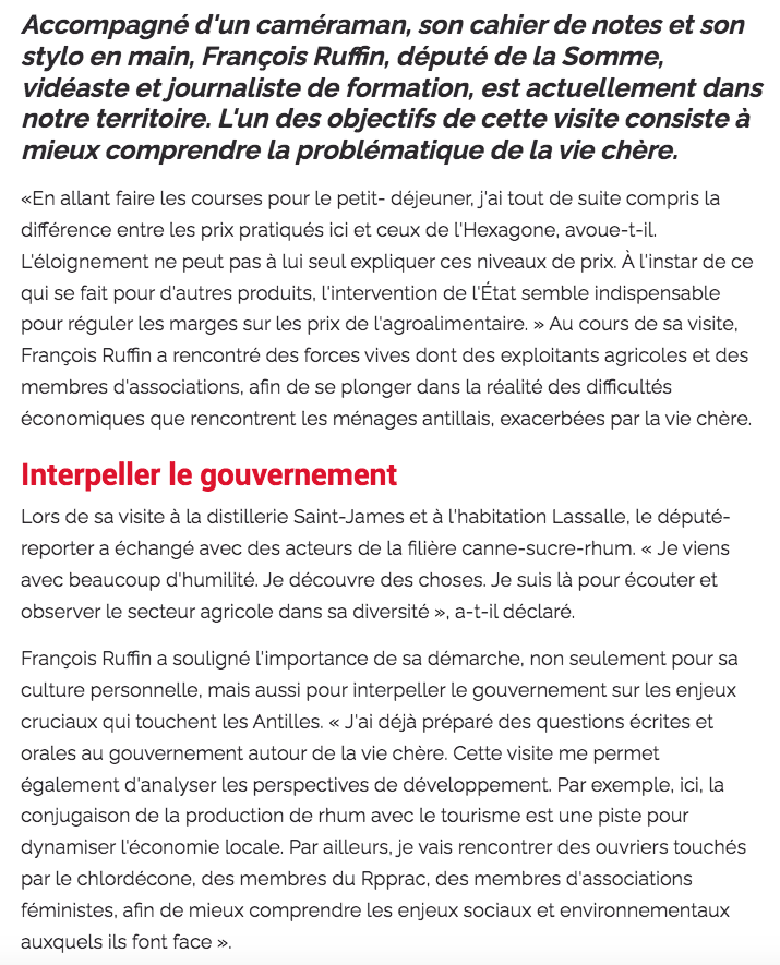 De passage en Martinique, François Ruffin s'est rendu à l'Habitation La Salle, où le responsable, Michel Fayad lui a raconté l'histoire et le parcours du rhum AOC, des habitations en Martinique, et la naissance du Spiritourisme, dans le cadre d'un reportage qu'il réalise sur l'ile. Étaient présents aussi, Antoine Dupontavice, le directeur général des rhums Saint-James, Eric Eugenie de la SICA Canne Union, Jérome Forget directeur des rhums La Mauny & Trois rivières, et tout nouveau président du CODERUM, ainsi que Claude Féliot, le secrétaire général.