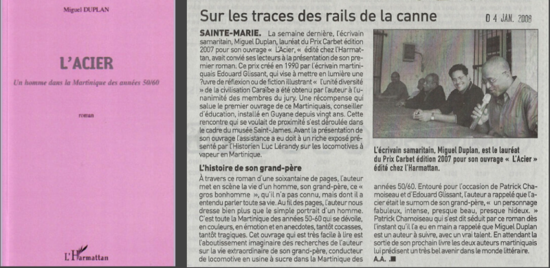 2007, Michel Fayad reçoit Edouard Glissant et Patrick Chamoiseau à la maison de la distillation pour la remise du Prix Carbet 2007, attribué au jeune écrivain samaritain, Miguel Duplan. Son ouvrage "l'Acier", édité chez l'Harmattan, raconte l'histoire de son grand-père, conducteur téméraire de la locomotive de l'usine de Sainte-marie, que l'Association "Les rails de la canne à sucre" a restauré de 1997 à 2002.