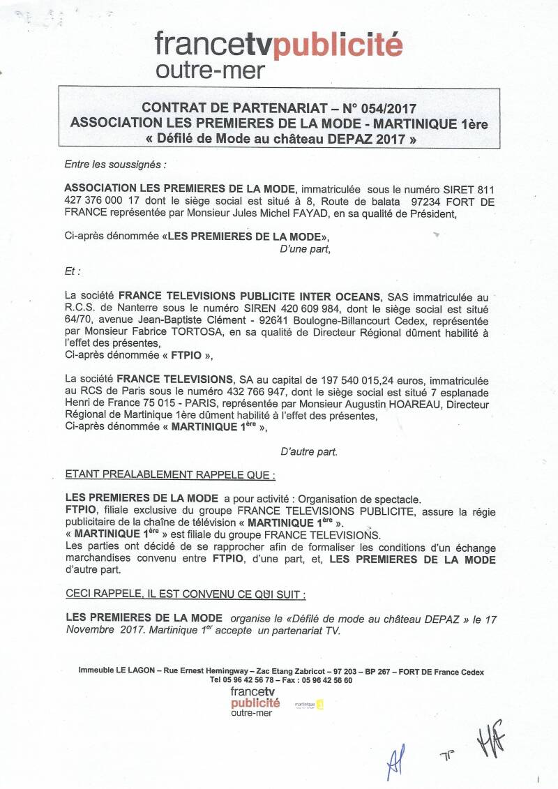 Ci dessus un extrait du contrat de partenariat entre l'association "Les Premières de la Mode " et la compagnie Corsair, pour le transport des créateurs de la "Fashion-Week" au Château Depaz. (extrait 1 page sur 6) A droite, le projet de diffusion des "Premières de la Mode" sur le réseau Corsair.