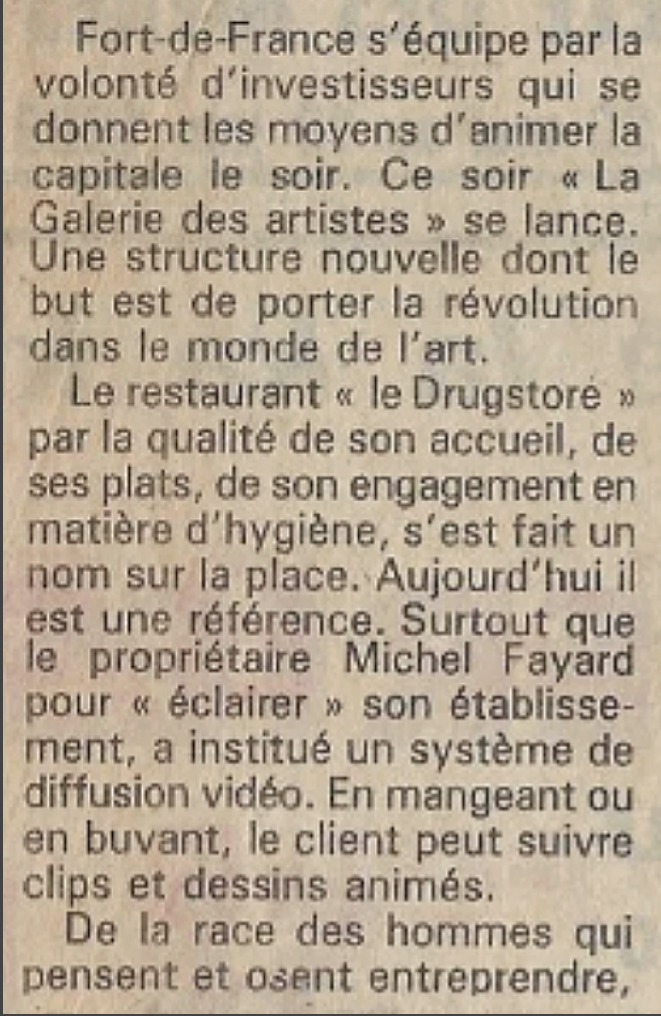 1983, Michel Fayad ouvre sur le front de mer de Fort de France, un nouveau concept en Martinique : "Le Drugstore de la Galerie", un ensemble, composé d'un Tabac-Journaux, un salon de coiffure, une location de voitures, un point FDJ-Loto-PMU, une Brasserie, un piano-bar, et une Galerie d'art.