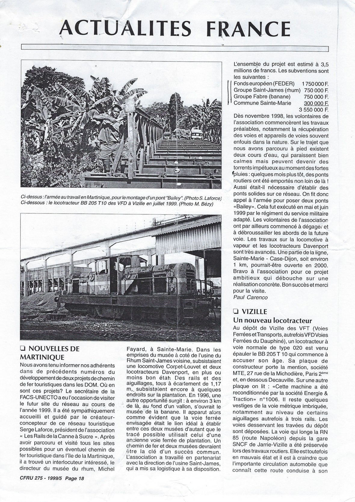 Michel Fayad, le trésorier fondateur de l'association, s'est souvenu du concours des militaires du RSMA * (Service Militaire Adapté de Martinique) , qu'il avait sollicité, huit ans plus tôt pour la pose de rails, et de 2 "Ponts Bailey" qui permettaient de traverser la "Rivière Cerise" et la "Rivière Pierrot":